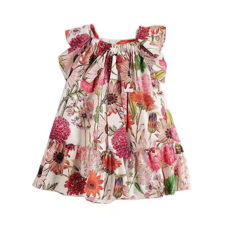 /Custom High Quality Kids Dress Pinafore Style Sleeveless Ruffles Floral Pattern Printing Baby Girl's Dresses