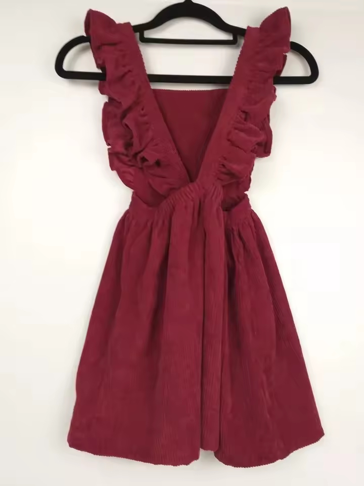/Maroon Embroidery Logo Customization Kids Girls 6-12 Years Old Corduroy Pinafore Dress Ruffle Straps Autumn Woven Print Pattern