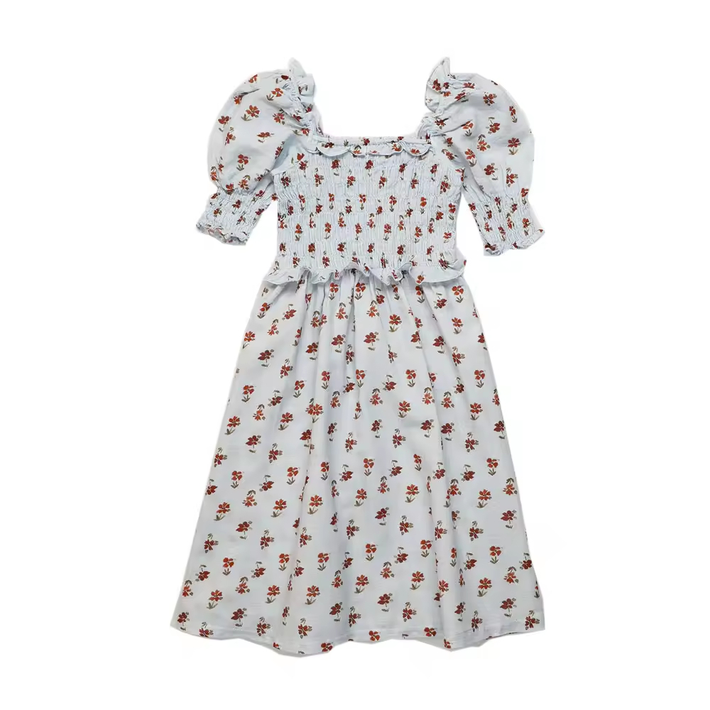 100% Cotton Girl Floral Printed Summer Casual Style Knee-Length Children's Clothing Fluffy Sleeves Smocking Designs Manufactured