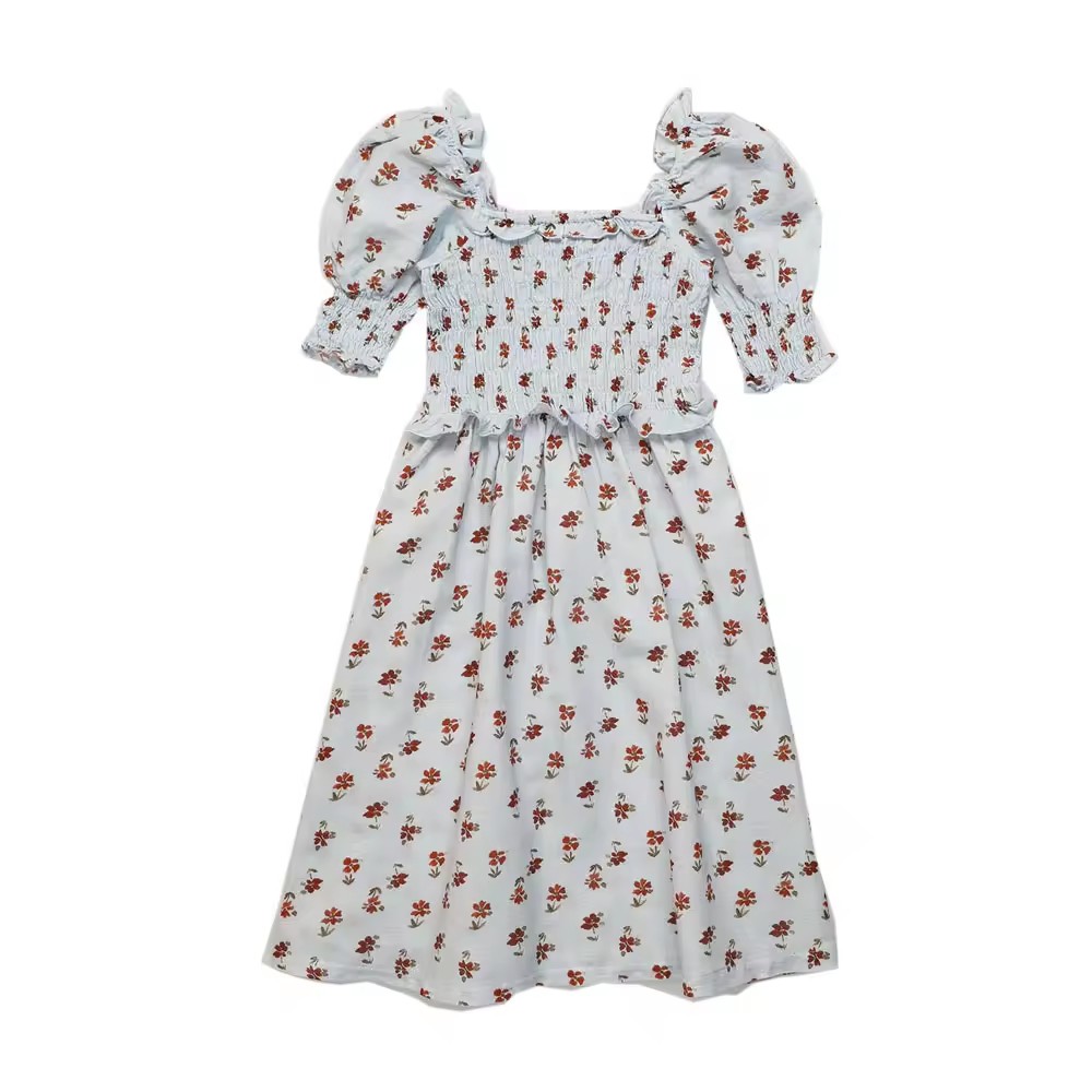 Private Label Navy Blue Floral Cotton Dress for Girls and Kids Woven A-Line Short Sleeve O-Neck Dress With Puffy Sleeves